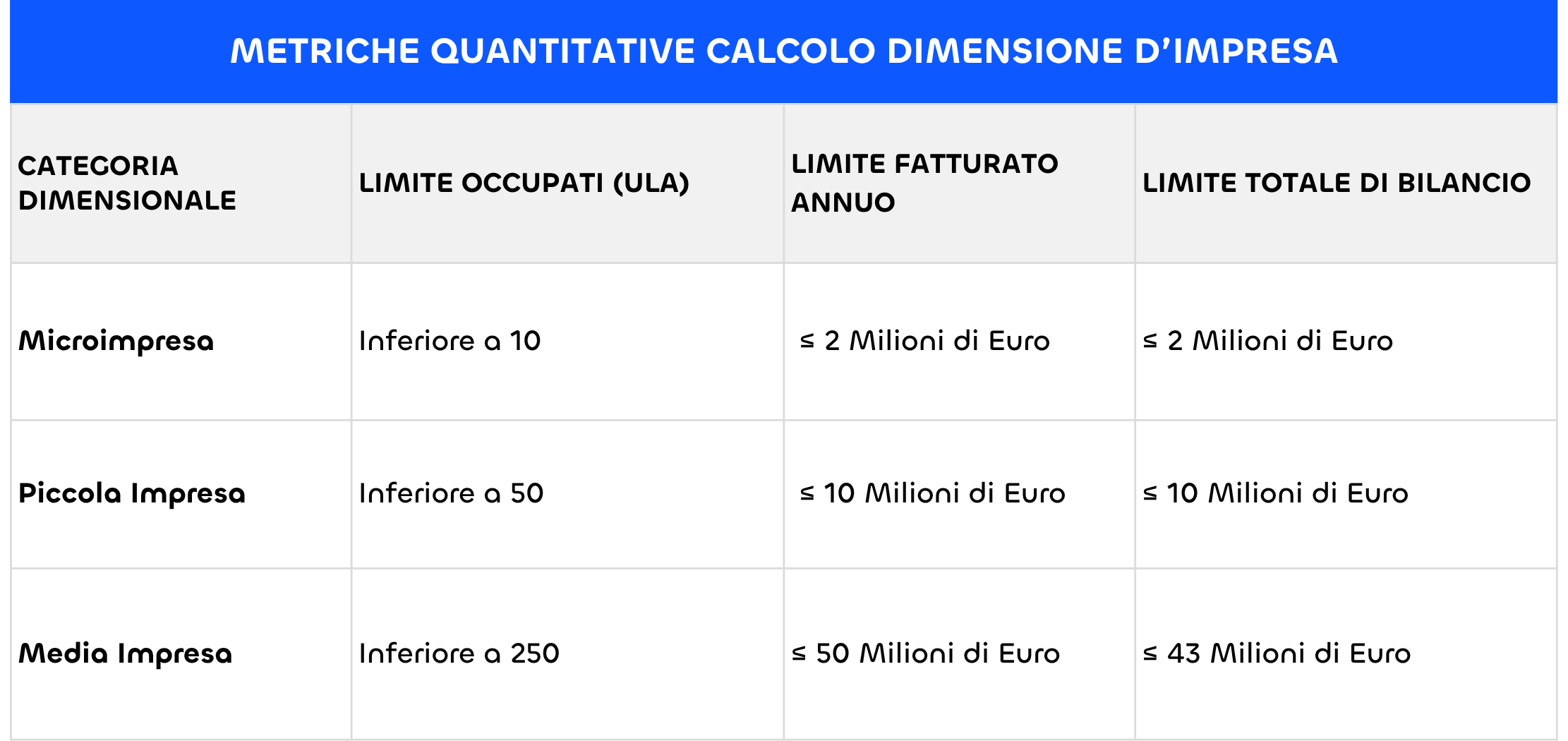 La determinazione della dimensione d'impresa si articola sull'osservazione simultanea di tre indicatori principali riferiti all'ultimo esercizio contabile chiuso ed approvato: il numero di dipendenti espresso in Unità Lavorative Annue (ULA), il fatturato annuo e il totale di bilancio, inteso come il totale dell'attivo patrimoniale. Affinché un'entità sia assegnata a una determinata categoria, è imperativo che rispetti il limite occupazionale e, contestualmente, non superi almeno uno dei due massimali finanziari.