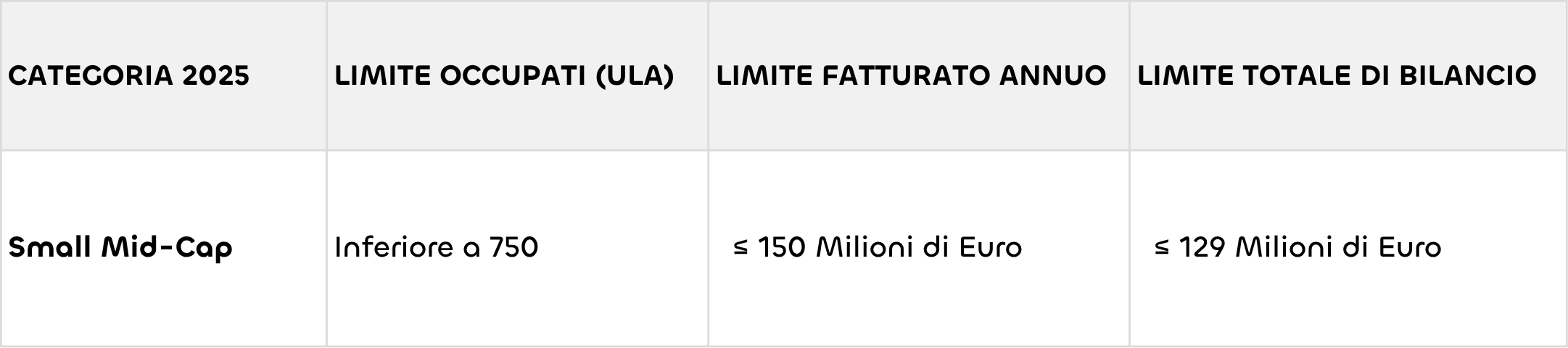 Secondo il nuovo quadro regolamentare, un'impresa assume la qualifica di Mid-Cap se non rientra più nei parametri della Raccomandazione 2003/361/CE e se, cumulativamente, mantiene un organico inferiore a 750 effettivi. A livello finanziario, i ricavi annuali non devono oltrepassare i 150 milioni di euro, oppure, in alternativa, l'attivo patrimoniale deve mantenersi al di sotto dei 129 milioni di euro.