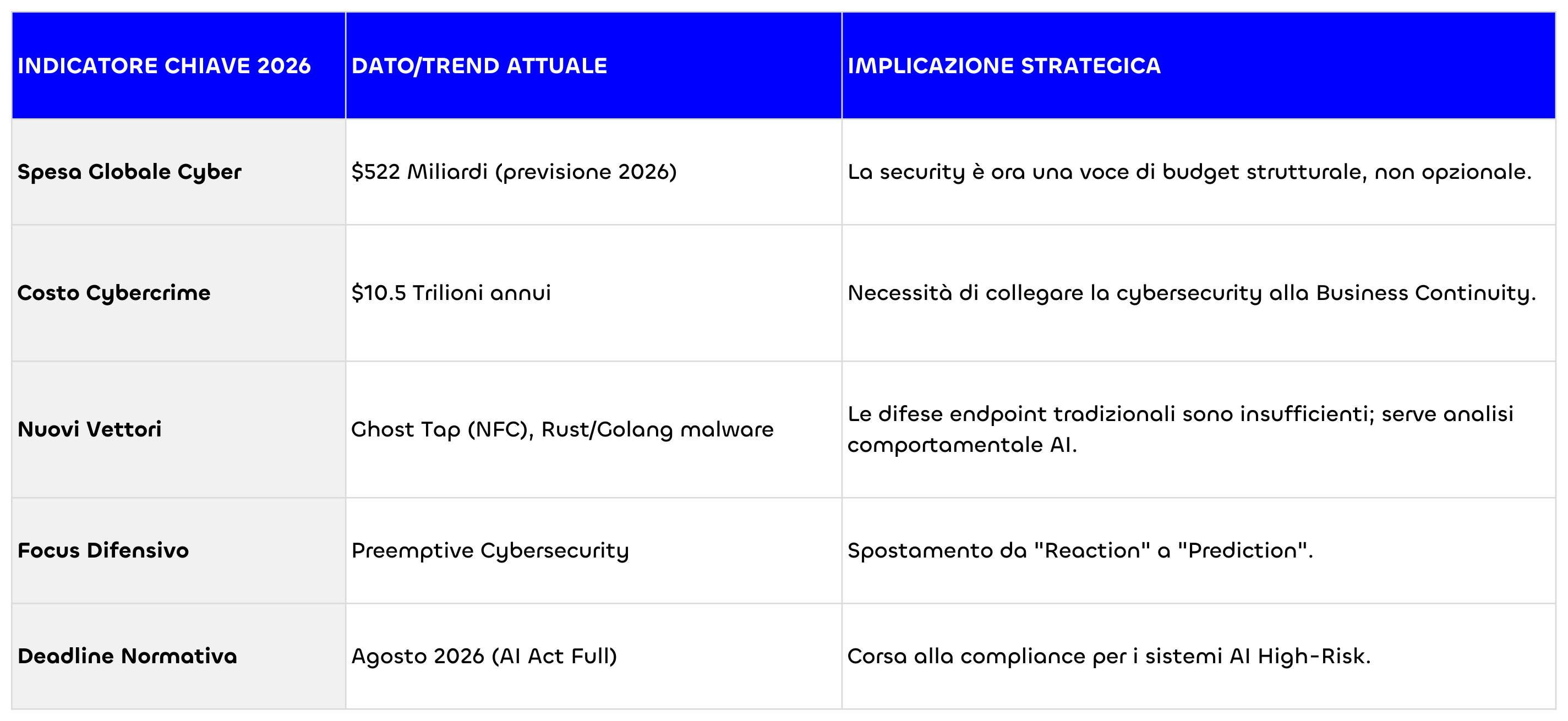 Per le aziende italiane, la sfida è duplice: difendersi da minacce esterne sempre più "intelligenti" e conformarsi internamente a normative europee rigorose come l'AI Act. Non è più sufficiente erigere muri; bisogna costruire un "sistema immunitario" digitale capace di prevedere l'infezione e reagire autonomamente. Chi riuscirà a trasformare la sicurezza da costo a vantaggio competitivo, garantendo continuità operativa anche sotto attacco, guiderà il mercato. Per gli altri, il 2026 rischia di essere un anno di selezione darwiniana digitale