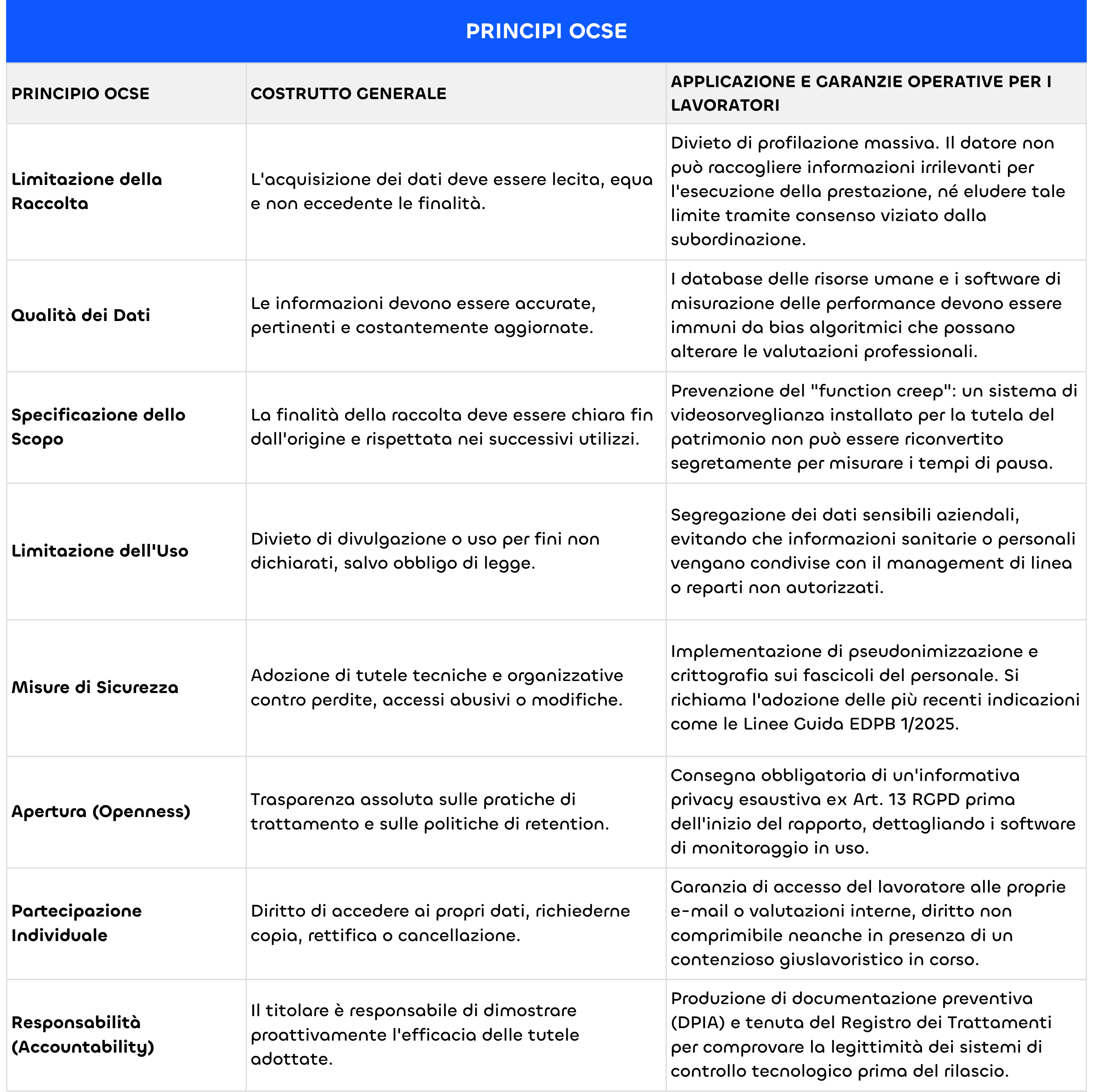 L'analisi di tali principi dimostra come il framework OCSE agisca da barriera architettonica contro la sorveglianza sproporzionata. Nel momento in cui le aziende digitalizzano i flussi di lavoro, i principi di "Limitazione della Raccolta" e "Specificazione dello Scopo" diventano i parametri primari per valutare la legittimità degli strumenti in uso.